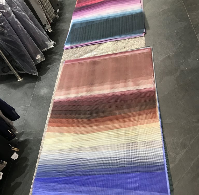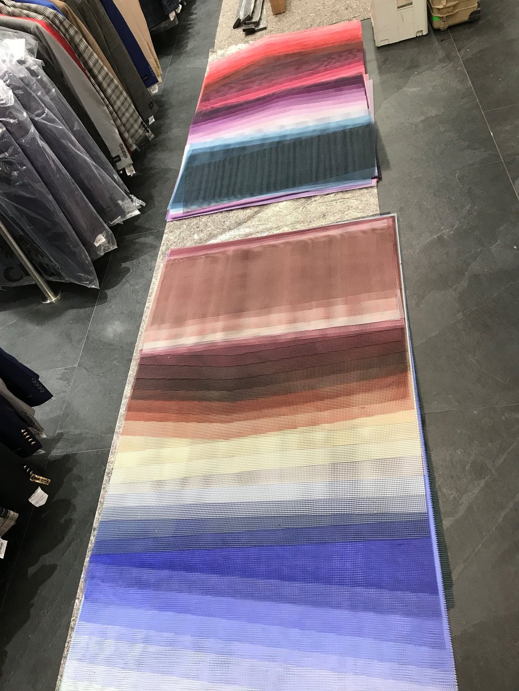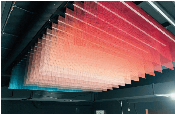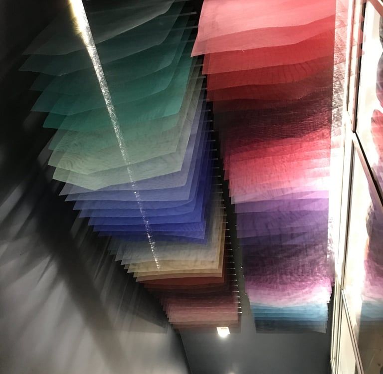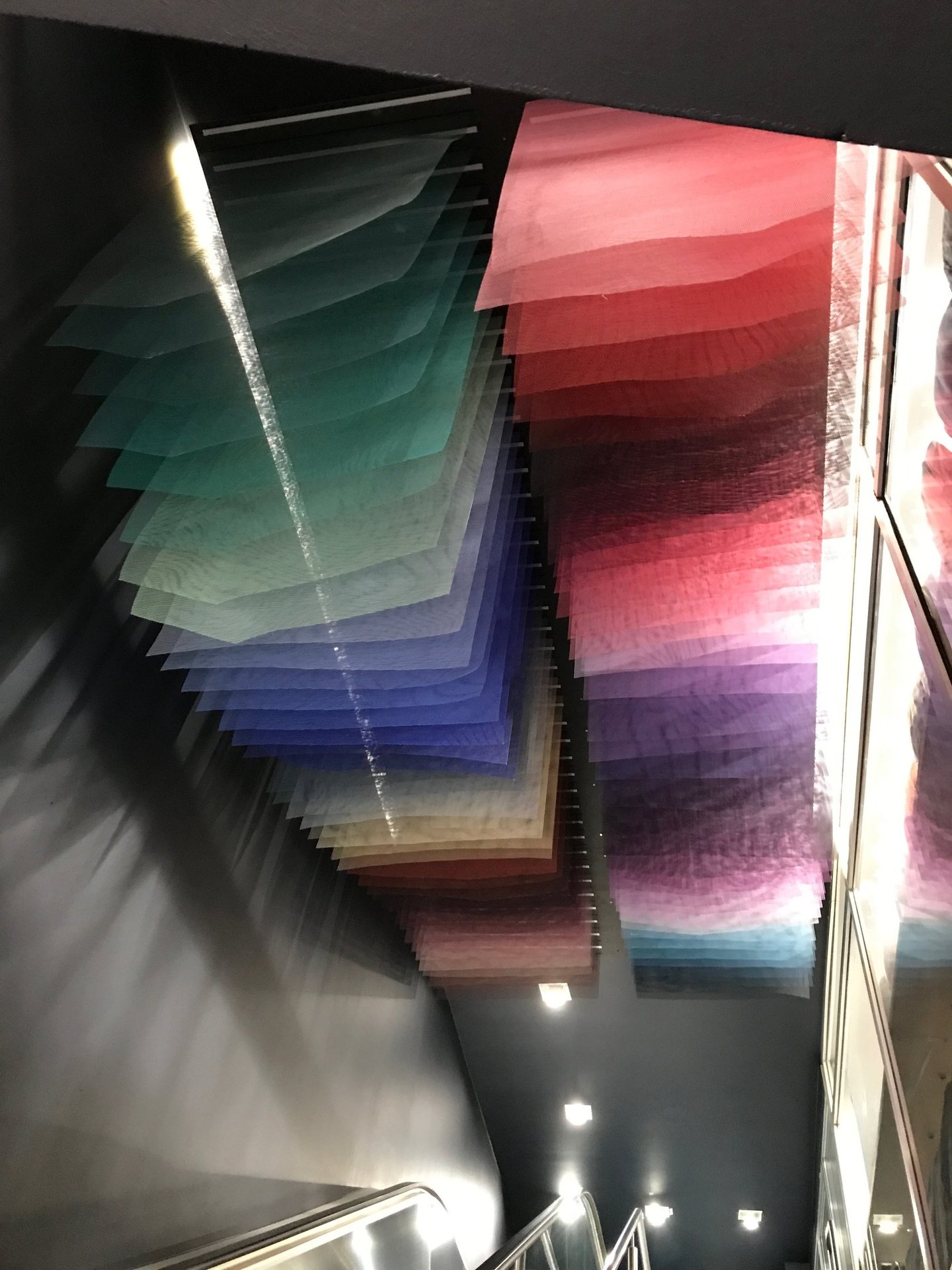 The piece features layered, translucent fabric sheets arranged in a gradient of colors, transitioning from deep greens and purples to bright reds and blues. The installation interacts dynamically with light, as it can also illuminate in various colors, enhancing the sense of movement and fluidity. This work highlights the interplay of texture, color, and light, creating an immersive visual experience for visitors.
