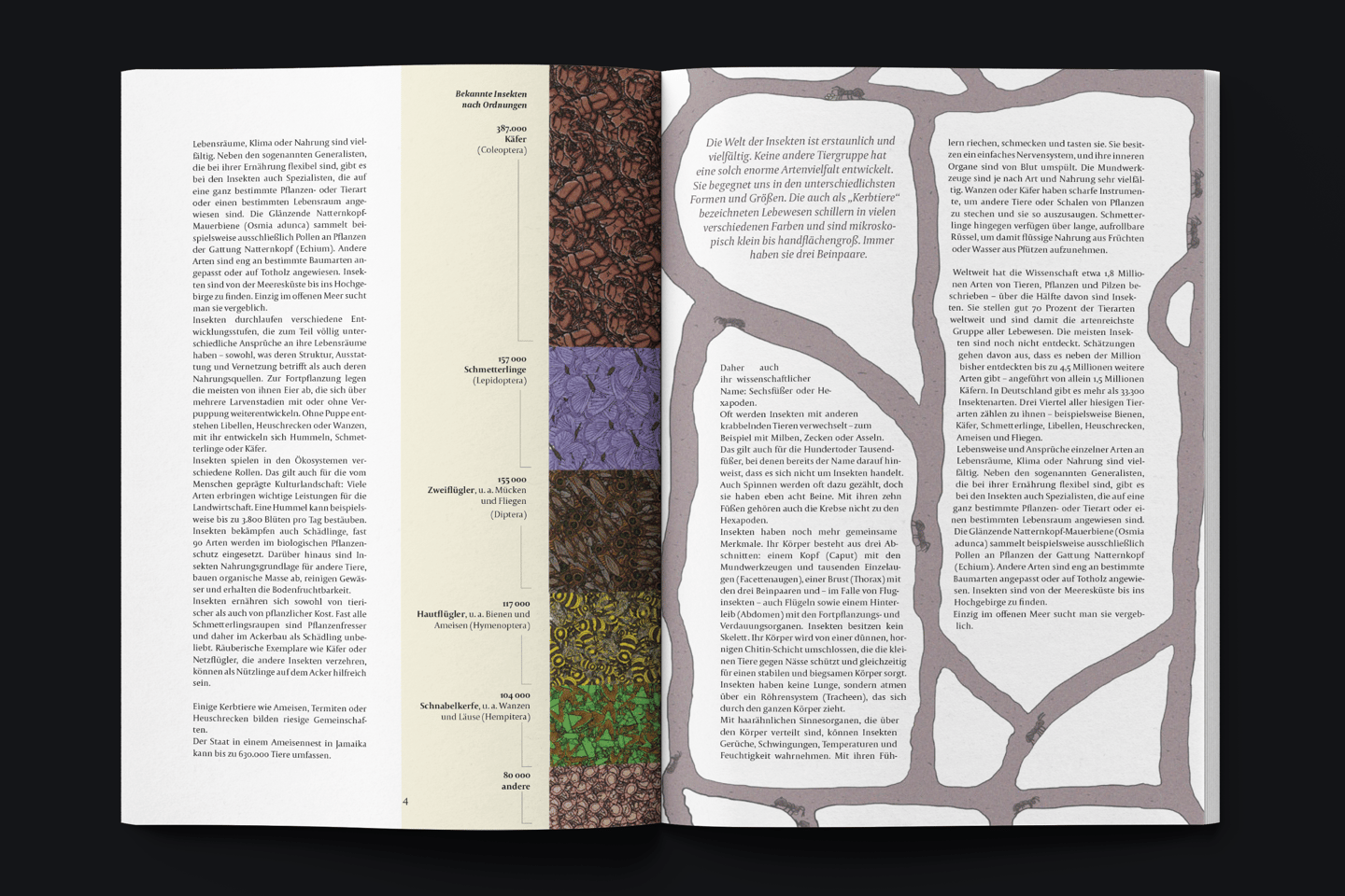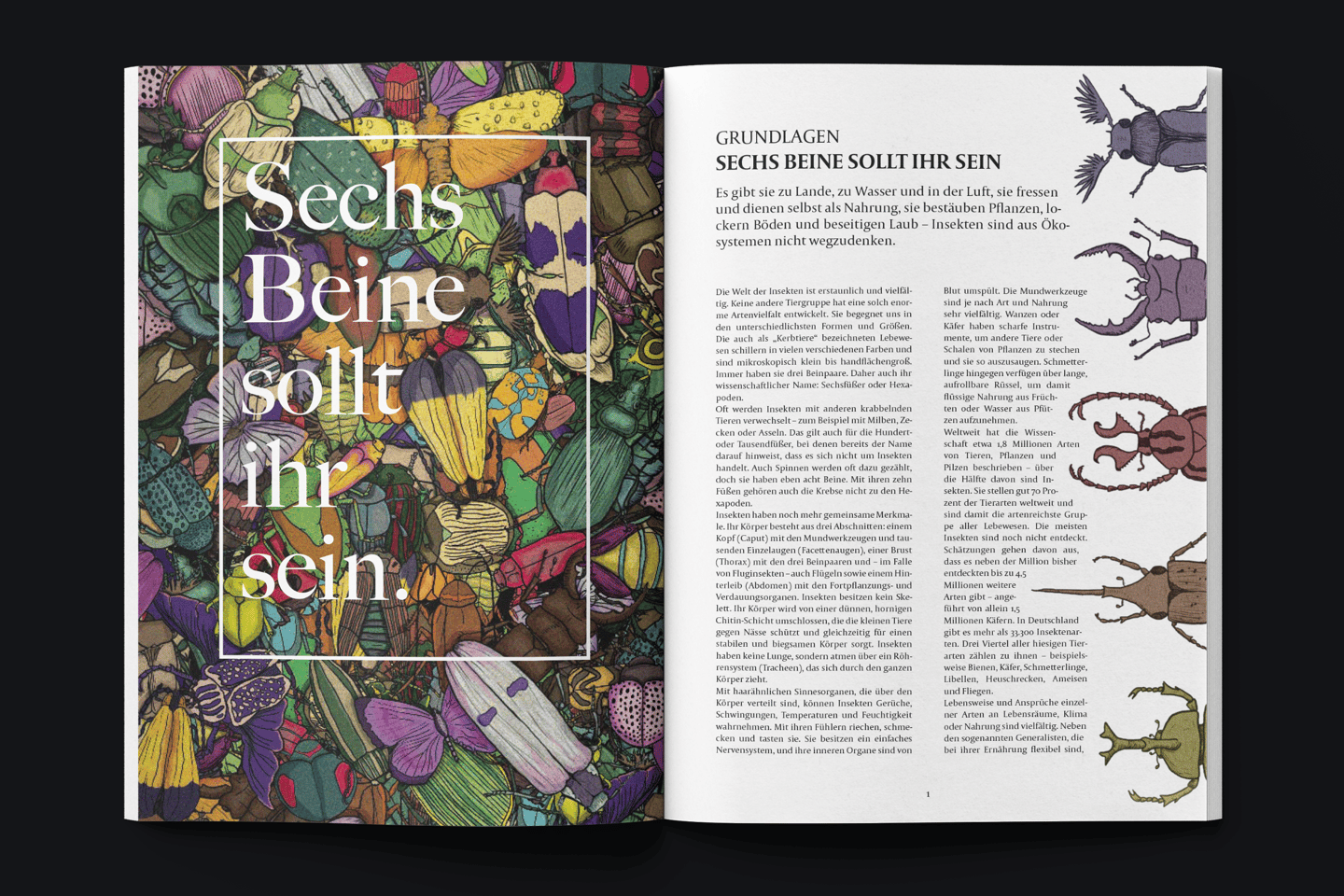 My article, "Sechs Beine sollt ihr sein" (Six Legs You Shall Have), is the first article in the atlas. It begins by presenting basic information about the world of insects. For example, it explains the anatomy of an insect and discusses the vast number of different species currently existing on our planet.