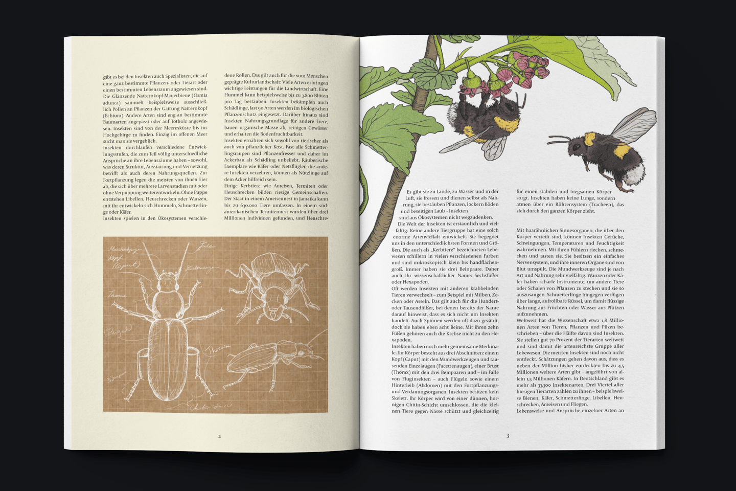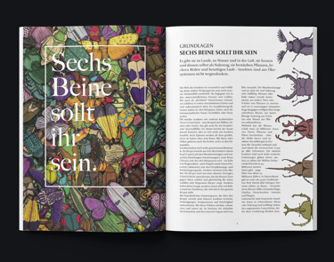 As part of a university project, the individual articles of the "Insect Atlas 2020," published by Heinrich Böll Verlag, were redesigned and interpreted with original illustrations by different students.